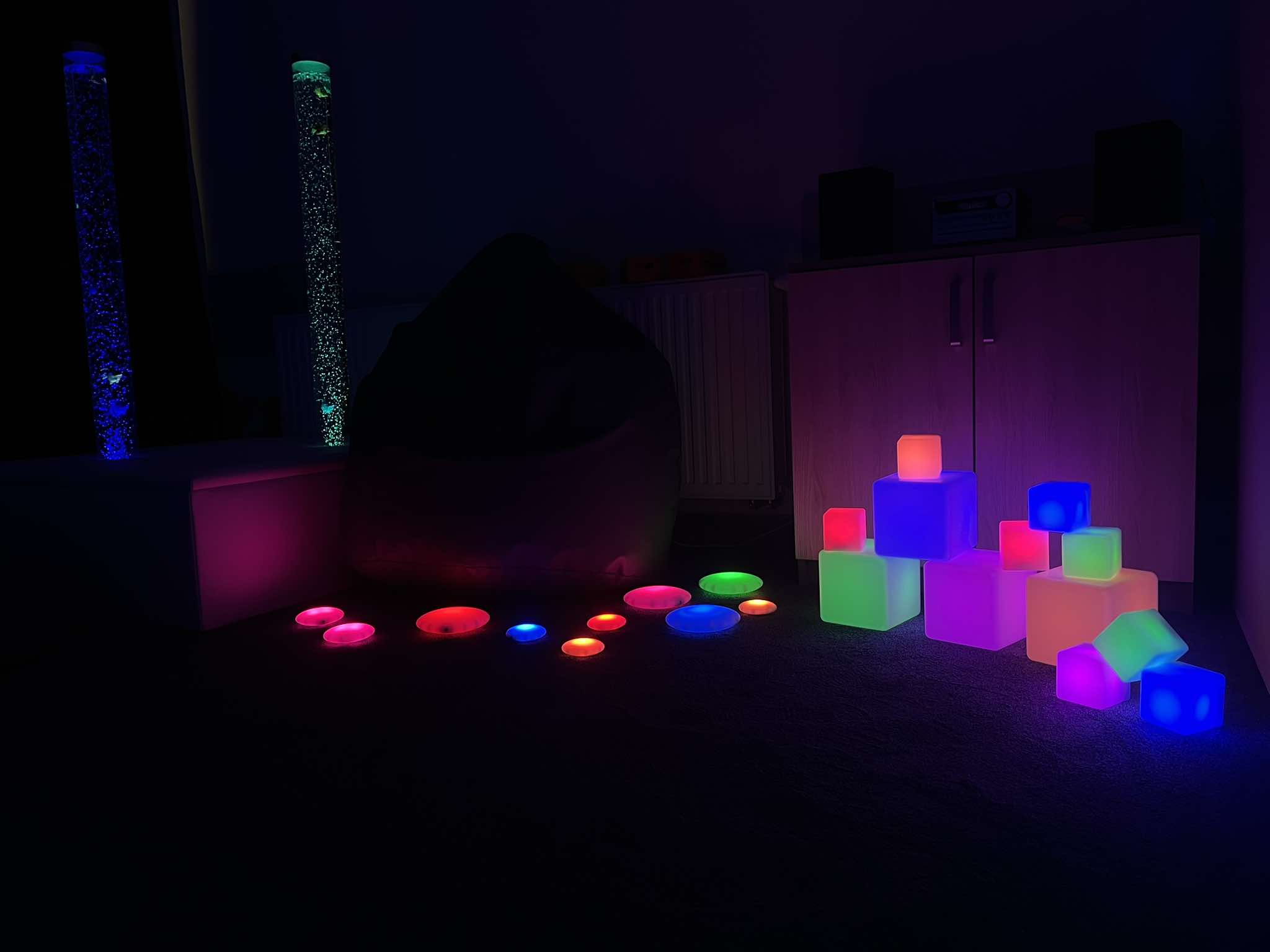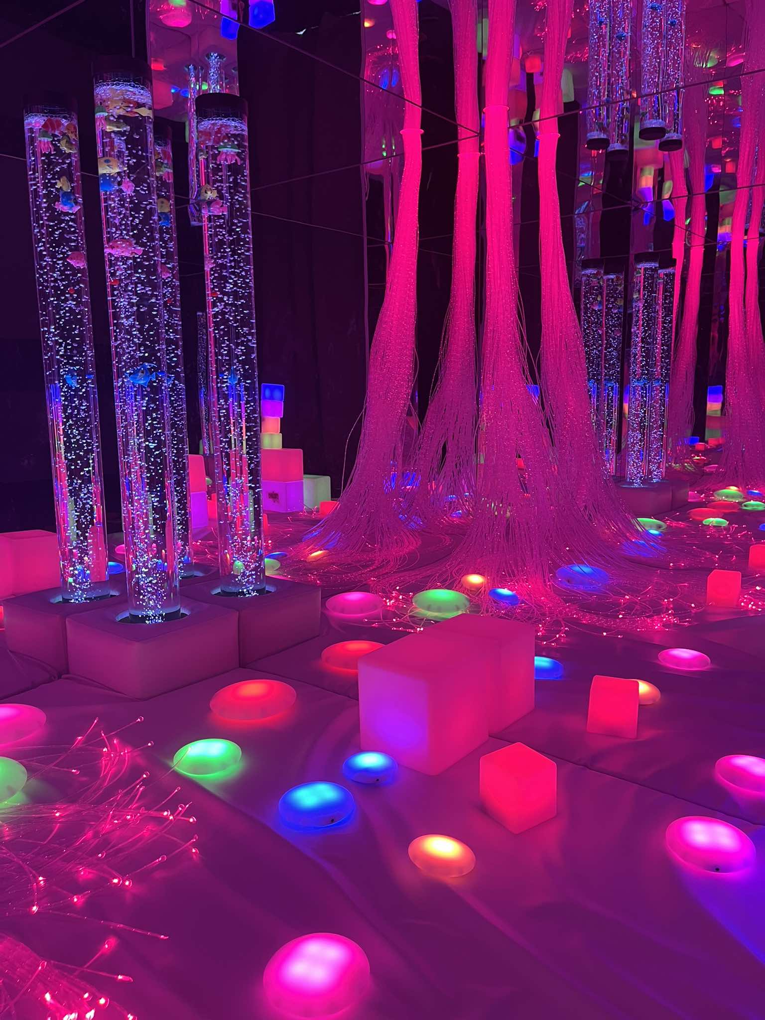 Pokój jest wyposażony w kolumny wodne, tablice świetlno-dźwiękowe, kabinę lustrzaną, podświetlane klocki, świecące kamienie i wiele innych ciekawostek.